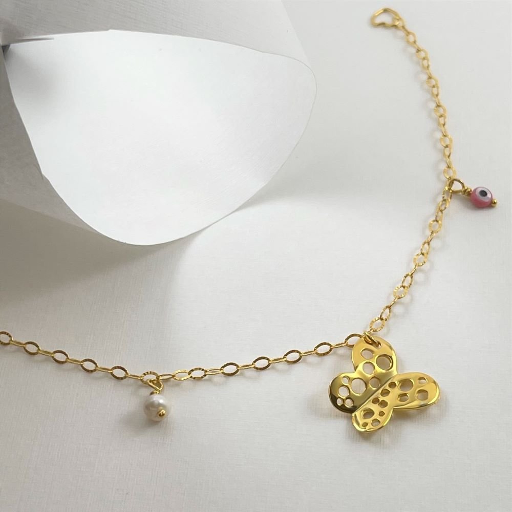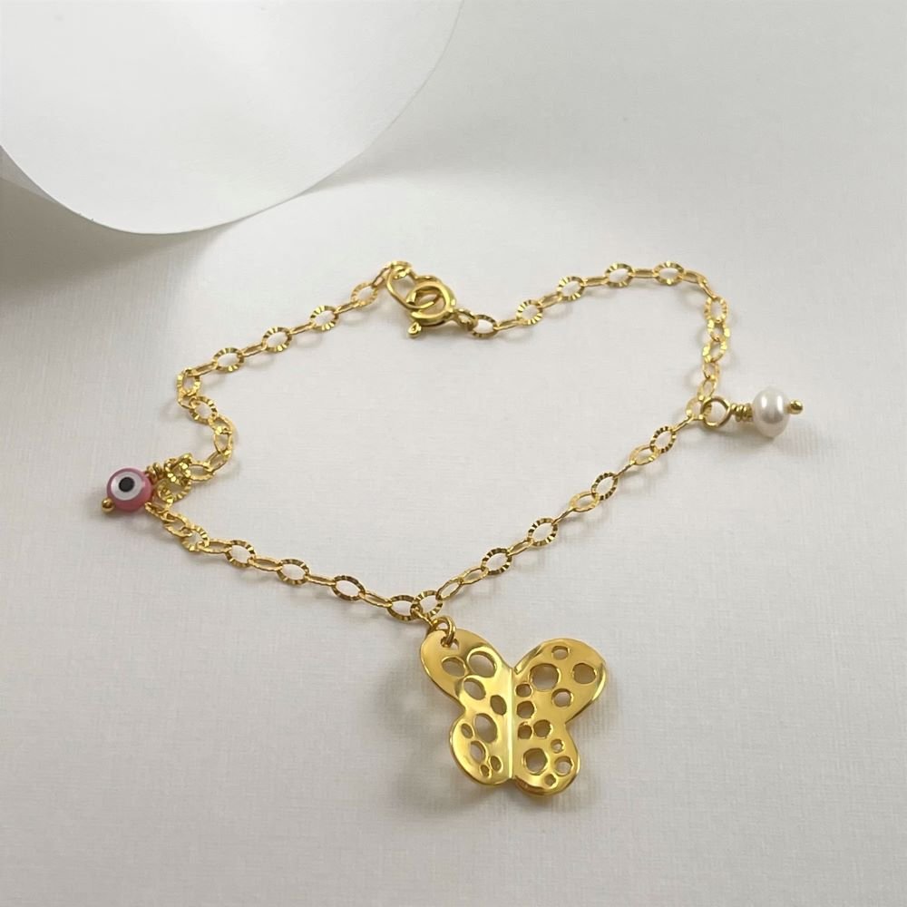 Bracelet "Butterfly" 1111 Bracelet "Butterfly" SKU 0047894 €58.00 Add to cart AVAILABLE Add to favorites Silver 925 gold-plated bracelet for children, decorated with a perforated butterfly, a pearl and an eye symbol. COLOR: COLOR YELLOWYELLOW METAL: METAL SILVERSILVER FINISHING: FINISHING SHINYSHINY STONE STONE JEWEL: JEWEL PEARLPEARL Quantity Guarantee Accompanied by quality and manufacture guarantee by ΚΛΖΛΝΛLBΛ.