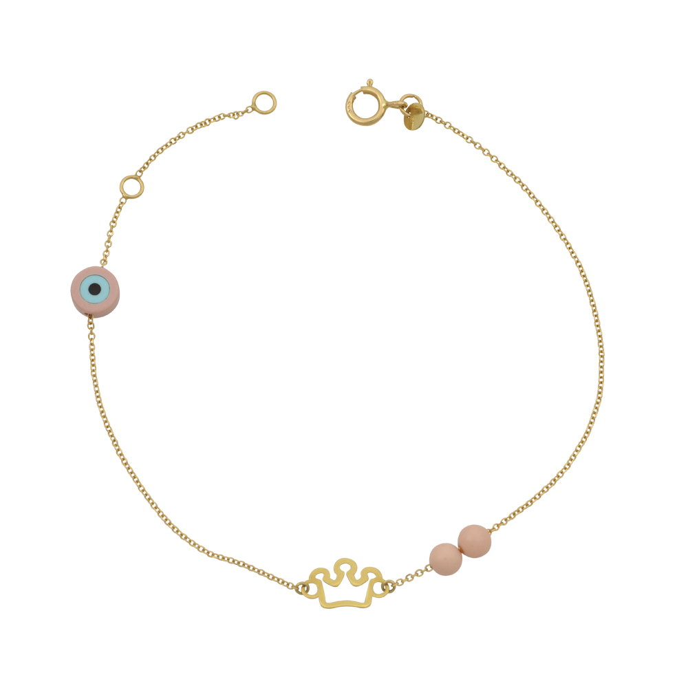 Bracelet "Crown and Eye symbol" Bracelet "Crown and Eye symbol" SKU 0038019 €215.00 Add to cart AVAILABLE Add to favorites Golden bracelet for children, decorated with a crown, an eye symbol and coral stones. COLOR: COLOR YELLOWYELLOW WHITEWHITE ROSE ROSE METAL: METAL GOLD K14GOLD K14 FINISHING: FINISHING SHINYSHINY STONE COLOR STONE COLOR ΧΡΩΜΑ ΛΙΘΟΥ: ΧΡΩΜΑ ΛΙΘΟΥ PINKPINK Weight 0.80 g Quantity Guarantee Accompanied by quality and manufacture guarantee by ΚΛΖΛΝΛLBΛ.