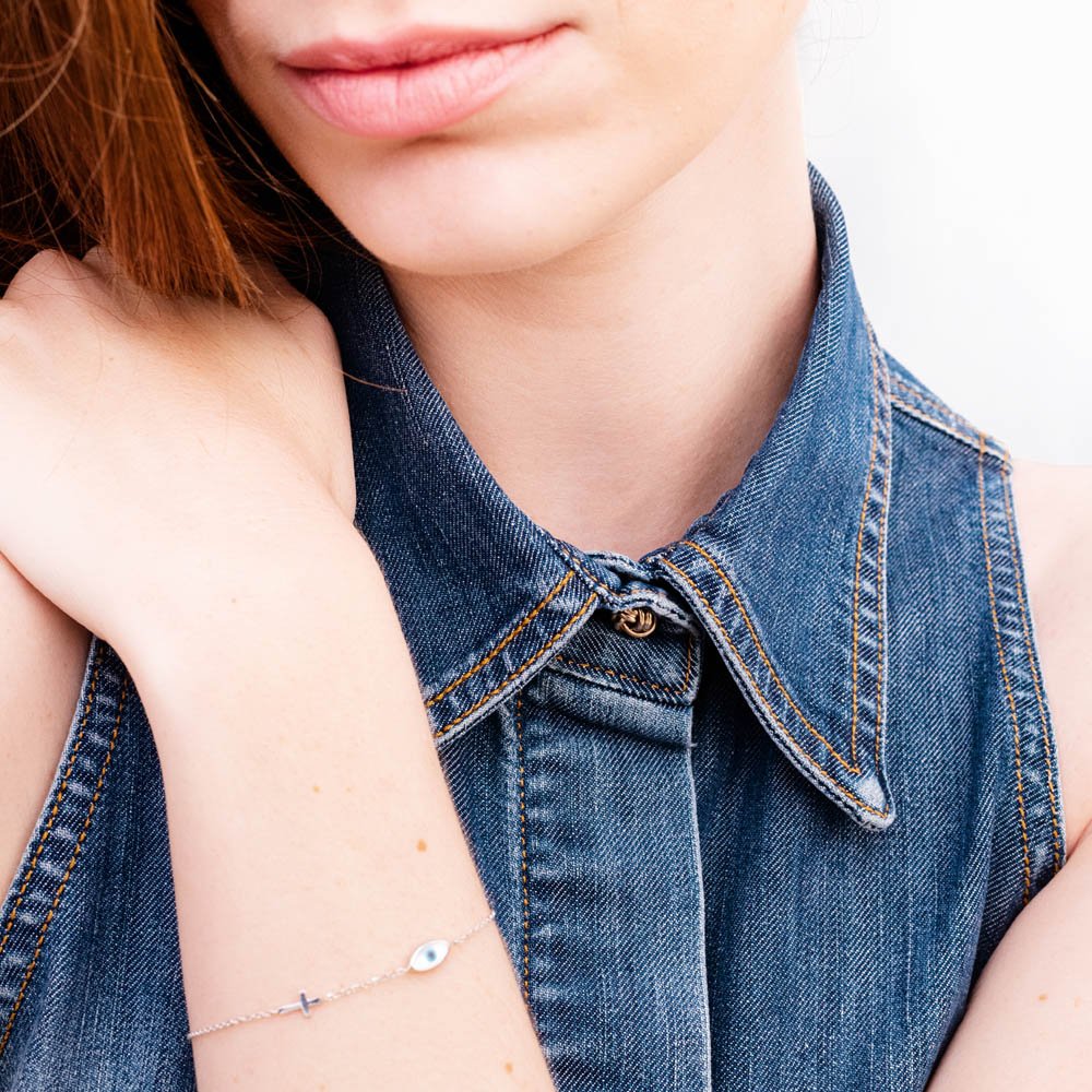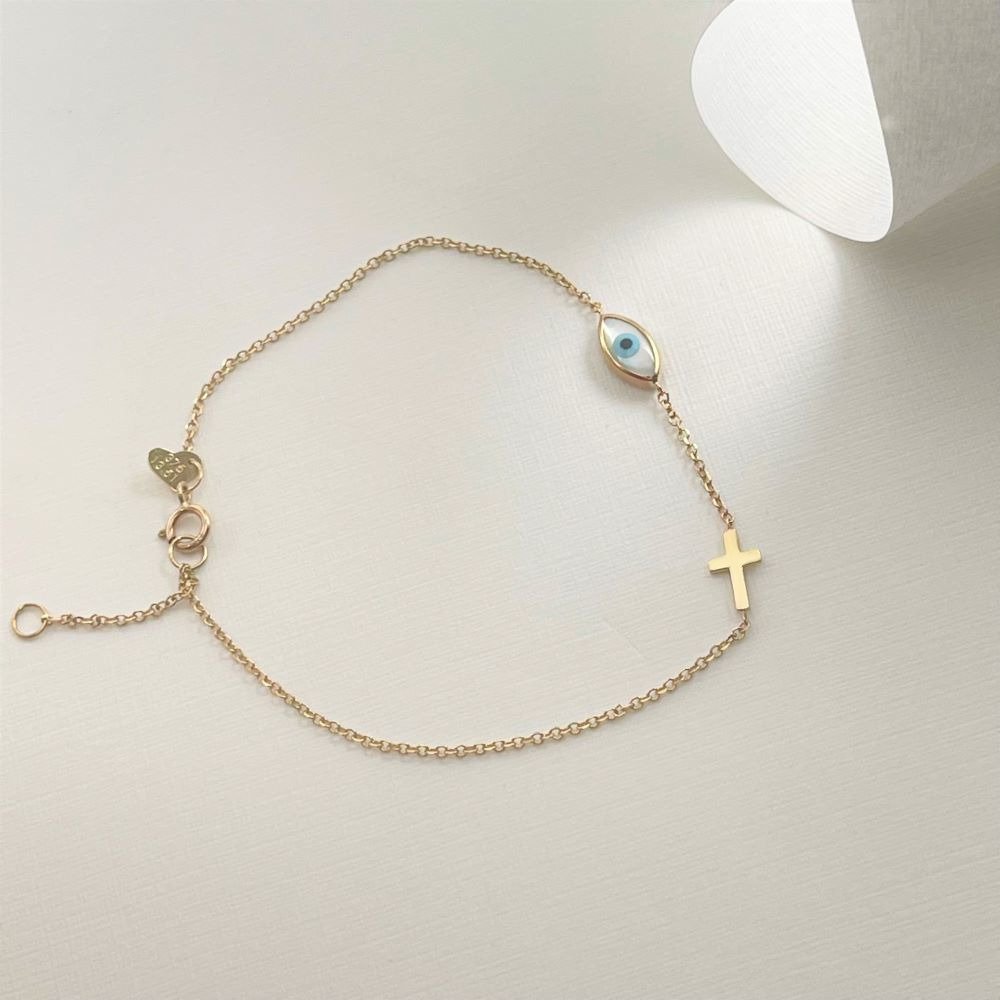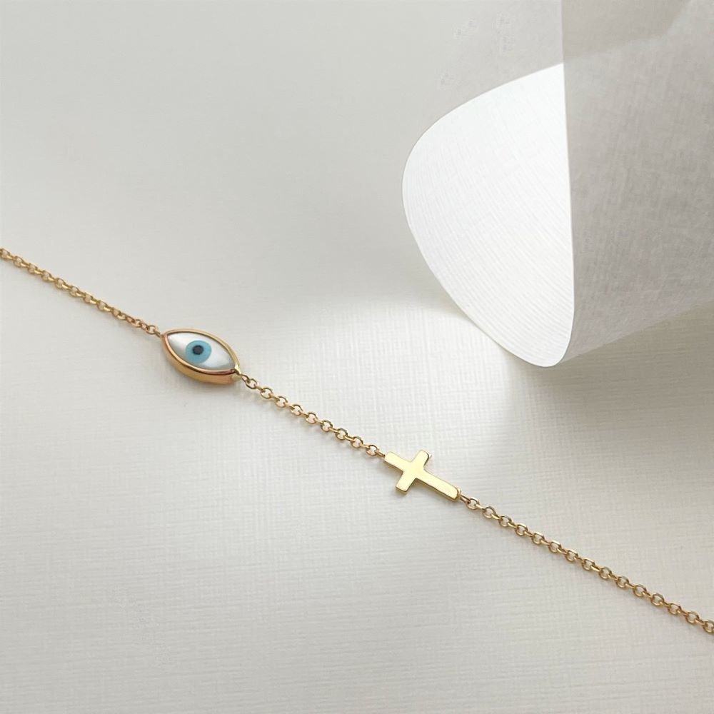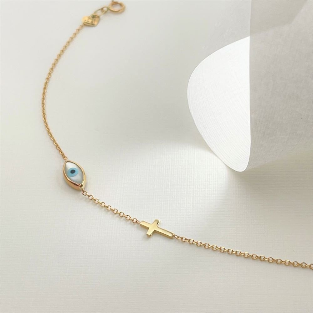 "Cross and Eye Symbol" Bracelet 1111 "Cross and Eye Symbol" Bracelet SKU 0047882 €155.00 Add to cart AVAILABLE Add to favorites Golden bracelet, decorated with a cross and an eye symbol, suitable for all ages. COLOR: COLOR YELLOWYELLOW WHITEWHITE ROSE ROSE METAL: METAL GOLD K9GOLD K9 FINISHING: FINISHING SHINYSHINY STONE STONE JEWEL: JEWEL MOTHER OF PEARLMOTHER OF PEARL Weight 0.80 g Quantity Guarantee Accompanied by quality and manufacture guarantee by ΚΛΖΛΝΛLBΛ.
