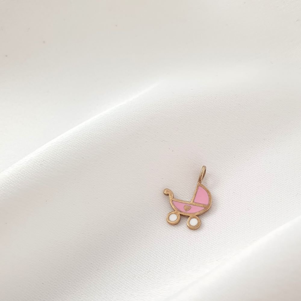 Μενταγιόν χρυσό καρότσι μωρού με ροζ & λευκό Σμάλτο