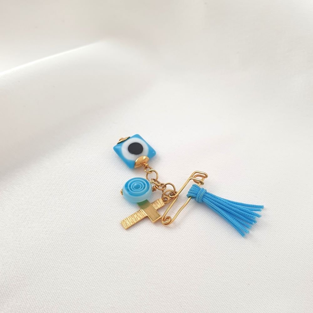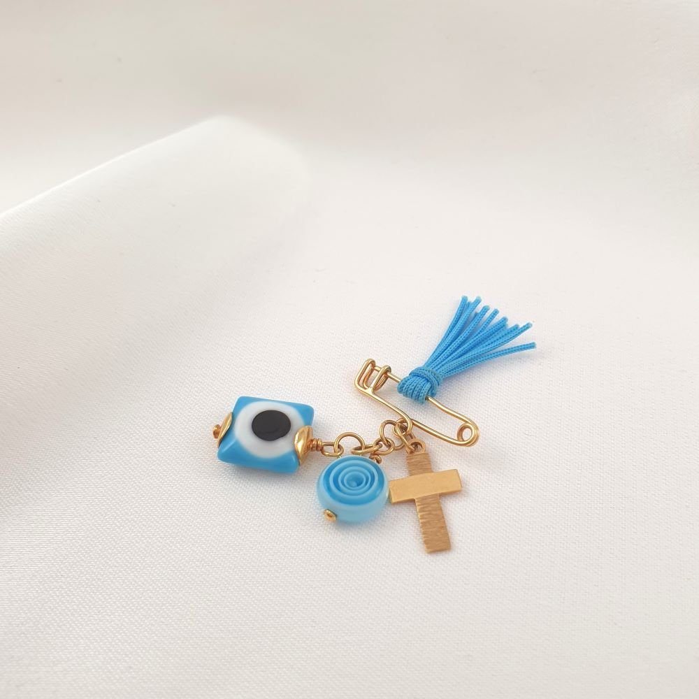 Παραμάνα χρυσή παιδική με Σταυρό, Μάτι & Φούντα από γαλάζιο Σμάλτο & Μουράνο