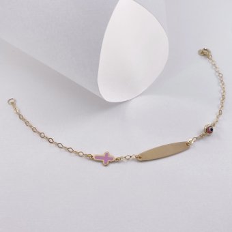 Βραχιόλι αλυσίδα χρυσή με σταυρουδάκι, κορώνα & ματάκι από ροζ & γαλάζιο Σμάλτο