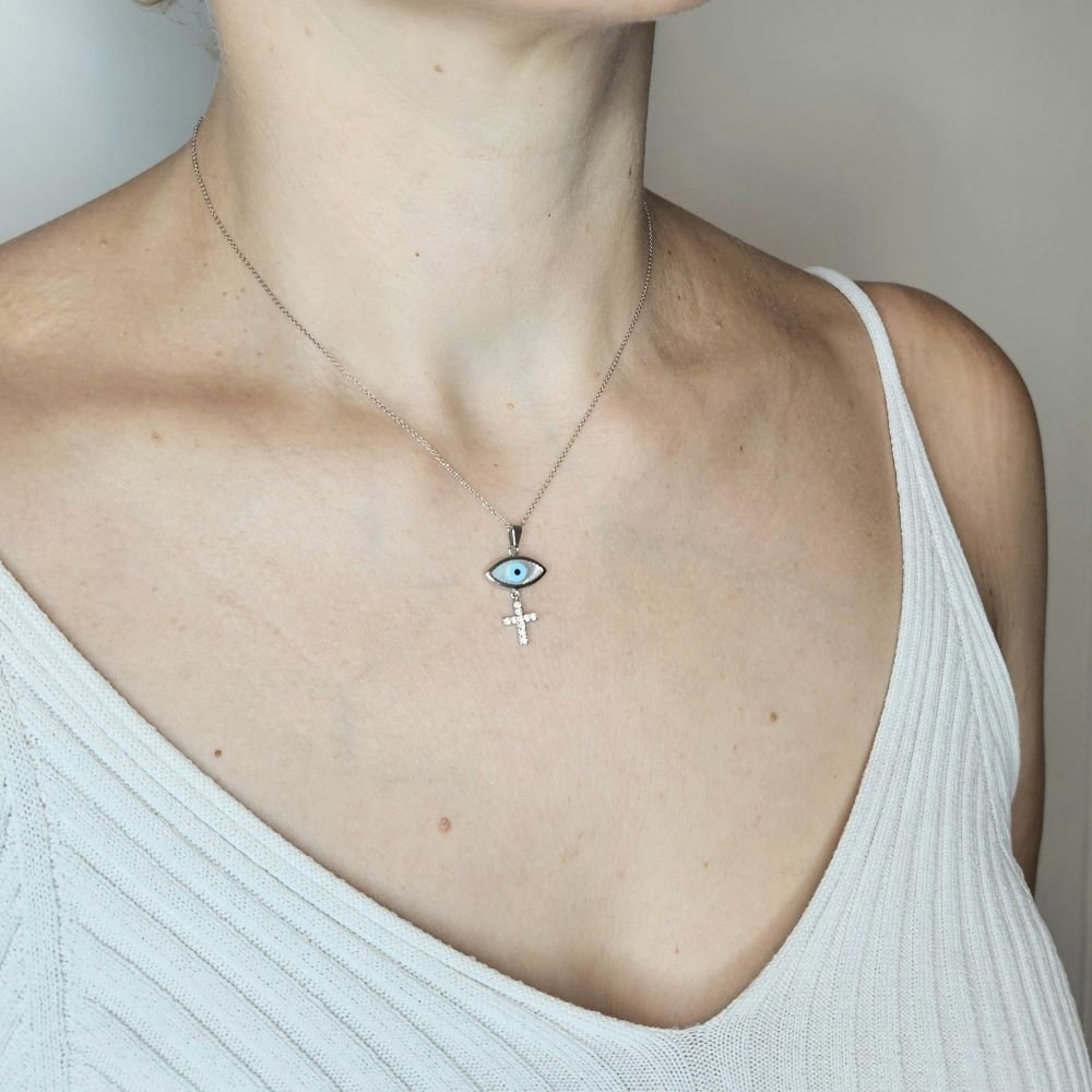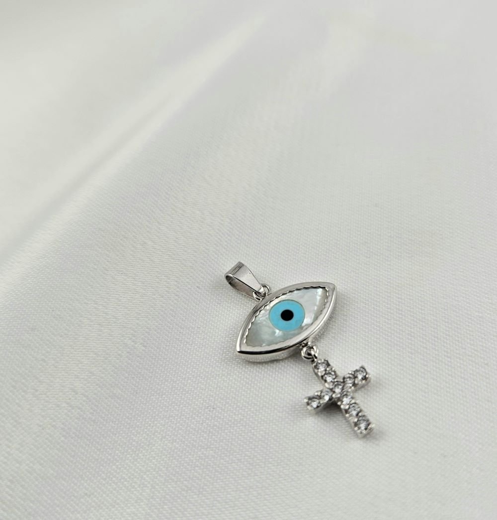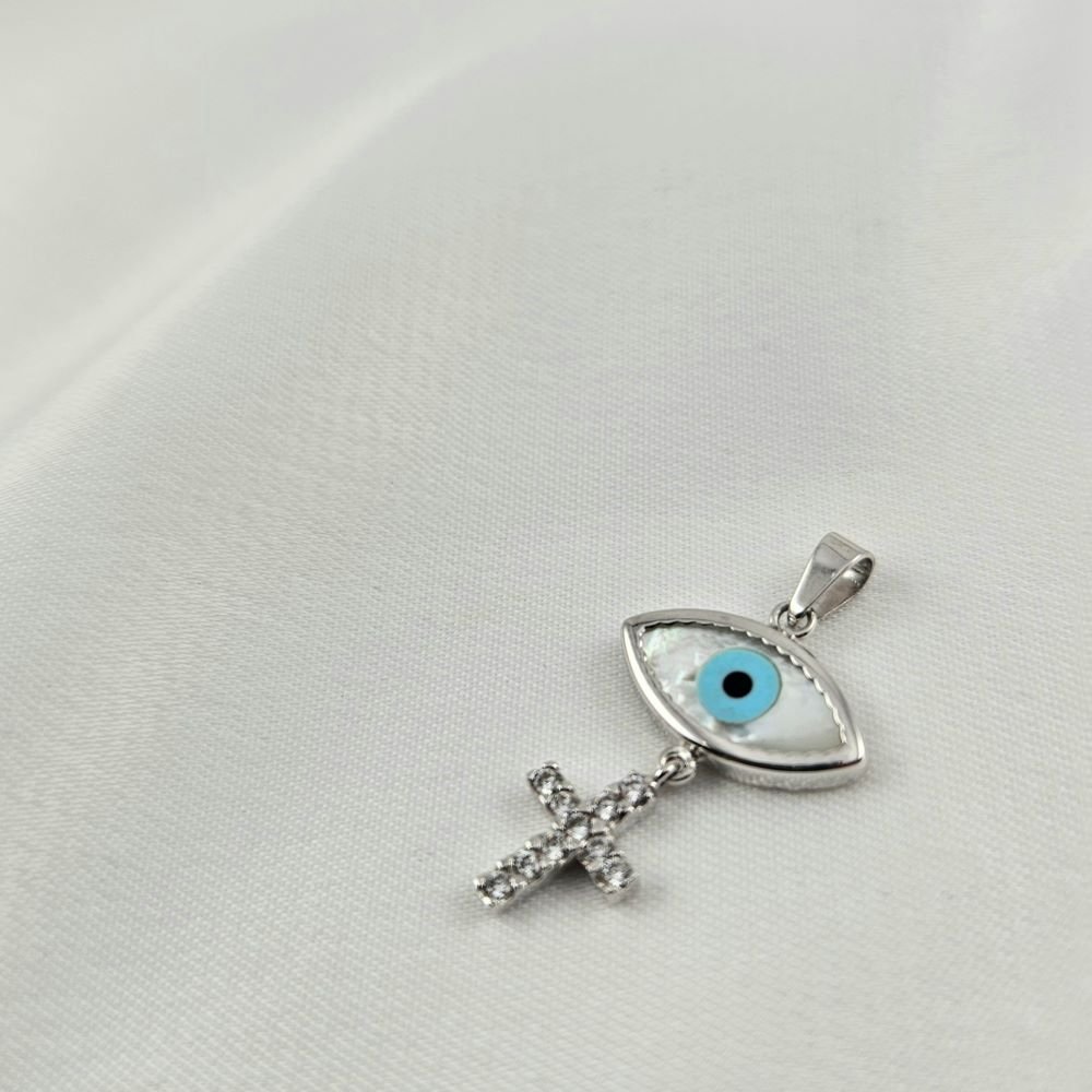 Μενταγιόν φυλακτό λευκόχρυσο ματάκι & σταυρός με Φίλντισι & Ζιργκον