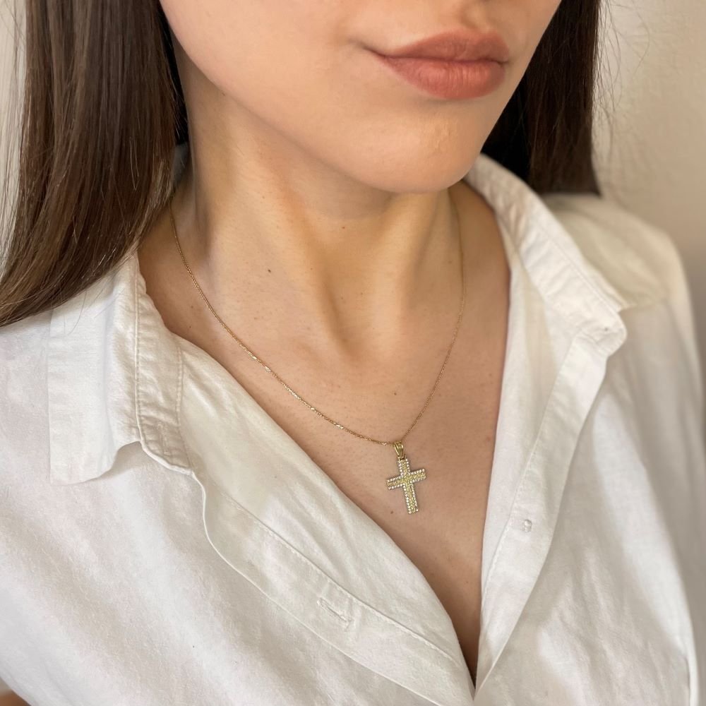 Σταυρός δίχρωμος με ζιργκόν 1111 Σταυρός δίχρωμος με ζιργκόν Κωδικός 0026773 465,00 € Προσθήκη στο καλάθι ΔΙΑΘΕΣΙΜΟ Προσθήκη στην wishlist Σταυρός χρυσός, δίχρωμος με ματ επεξεργασία στο κέντρο και διακοσμημένος περιμετρικά με αστραφτερές ζιργκόν πέτρες σε λευκό χρώμα. Αν χρειάζεστε βοήθεια για την επιλογή σταυρού παρακολουθήστε το παρακάτω βίντεο. ΧΡΩΜΑ ΜΕΤΑΛΛΟΥ: ΧΡΩΜΑ ΜΕΤΑΛΛΟΥ ΚΙΤΡΙΝΟ-ΛΕΥΚΟΚΙΤΡΙΝΟ-ΛΕΥΚΟ ΜΕΤΑΛΛΟ: ΜΕΤΑΛΛΟ ΧΡΥΣΟΣ K14ΧΡΥΣΟΣ K14 ΕΠΕΞΕΡΓΑΣΙΑ: ΕΠΕΞΕΡΓΑΣΙΑ ΜΑΤΜΑΤ ΛΙΘΟΣ ΛΙΘΟΣ ΛΙΘΟΣ: ΛΙΘΟΣ ΖΙΡΓΚΟΝΖΙΡΓΚΟΝ ΧΡΩΜΑ ΛΙΘΟΥ ΧΡΩΜΑ ΛΙΘΟΥ ΧΡΩΜΑ ΛΙΘΟΥ: ΧΡΩΜΑ ΛΙΘΟΥ WHITEWHITE Διαστασεις Οι διαστάσεις του σταυρού είναι 32x17,5 mm (η πρώτη διάσταση είναι μαζί με τον κρίκο). Βαρος 2,10 g Ποσότητα Εγγυηση Συνοδεύεται από εγγύηση ποιότητας και κατασκευής από το ΚΛΖΛΝΛLBΛ.
