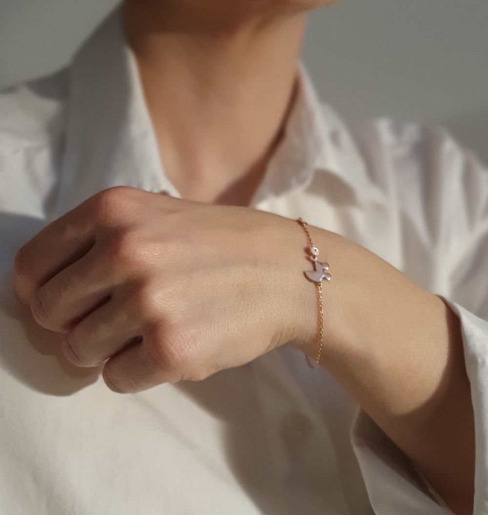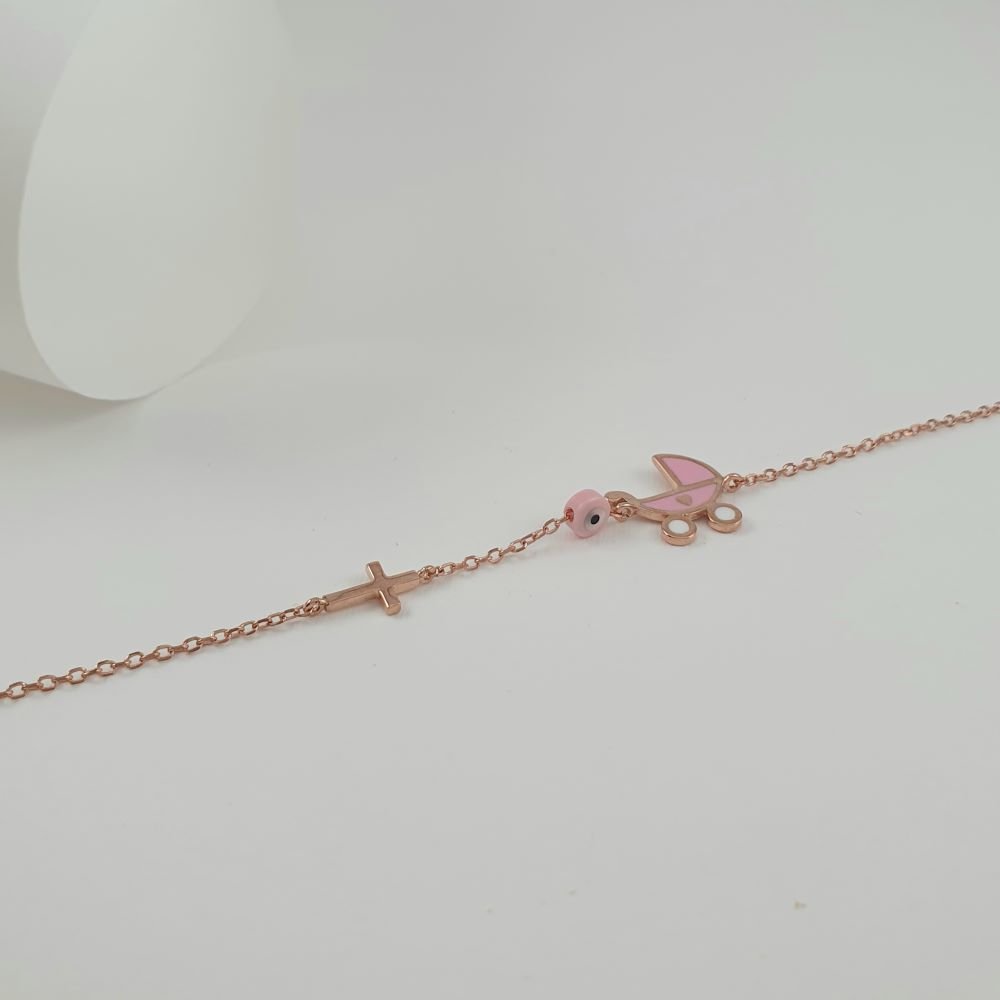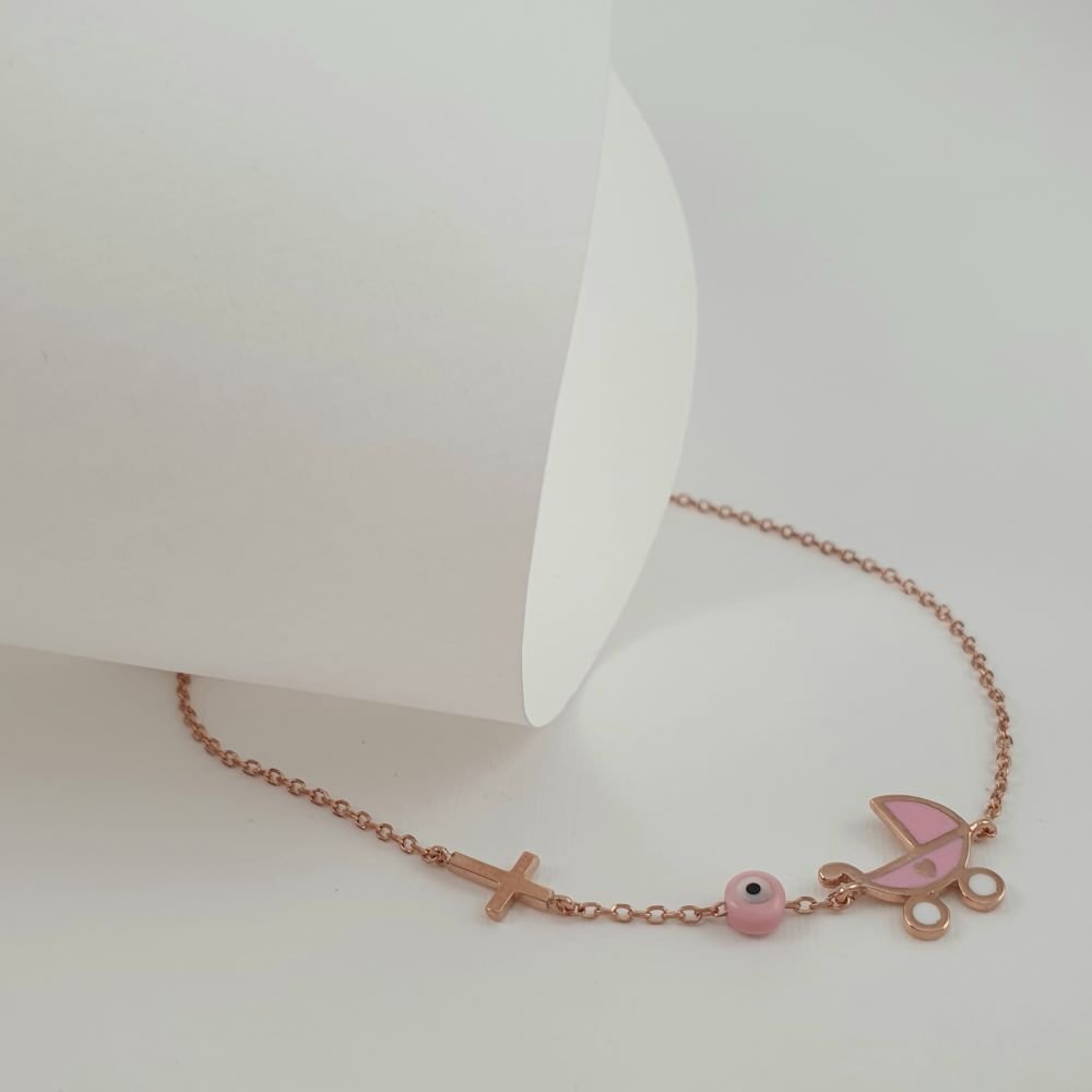 Βραχιόλι αλυσίδα χρυσή με σταυρουδάκι, ματάκι & καροτσάκι από ροζ Σμάλτο