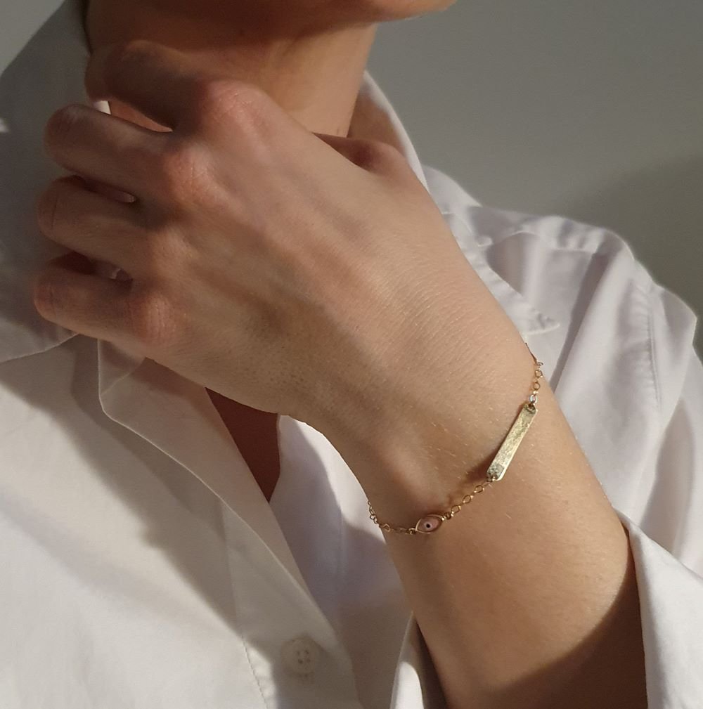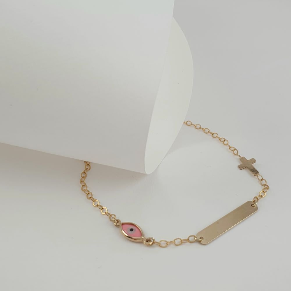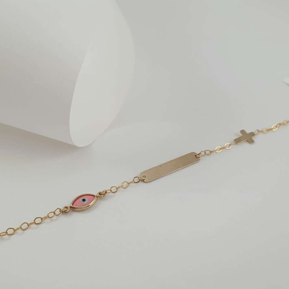 Βραχιόλι ταυτότητα χρυσή με σταυρουδάκι & ματάκι από Φίλντισι & ροζ Σμάλτο